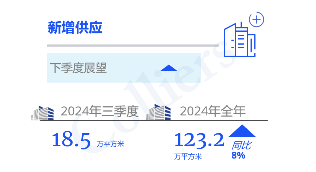 第三季度,上海的核心区和次中心区板块均有新项目入市,录得18.5万平方米的新增供应量。预计2024全年新增供应量高达到123万平方米,为近五年内最高供应。