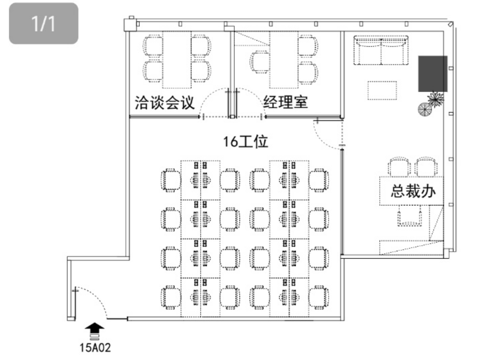 功能布局:3个隔断+16个工位+logo墙
